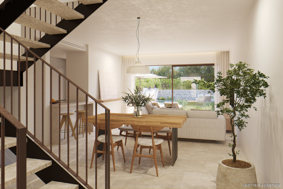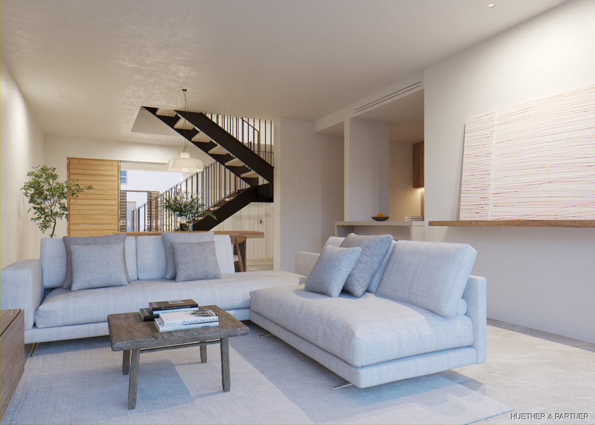 Die Wohnfläche verteilt sich auf zwei Etagen und verfügt über einen offenen Wohn-/Essbereich,