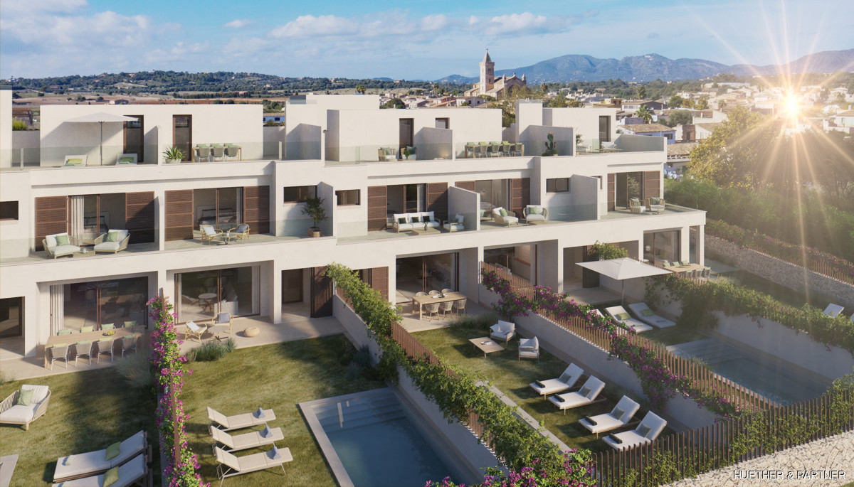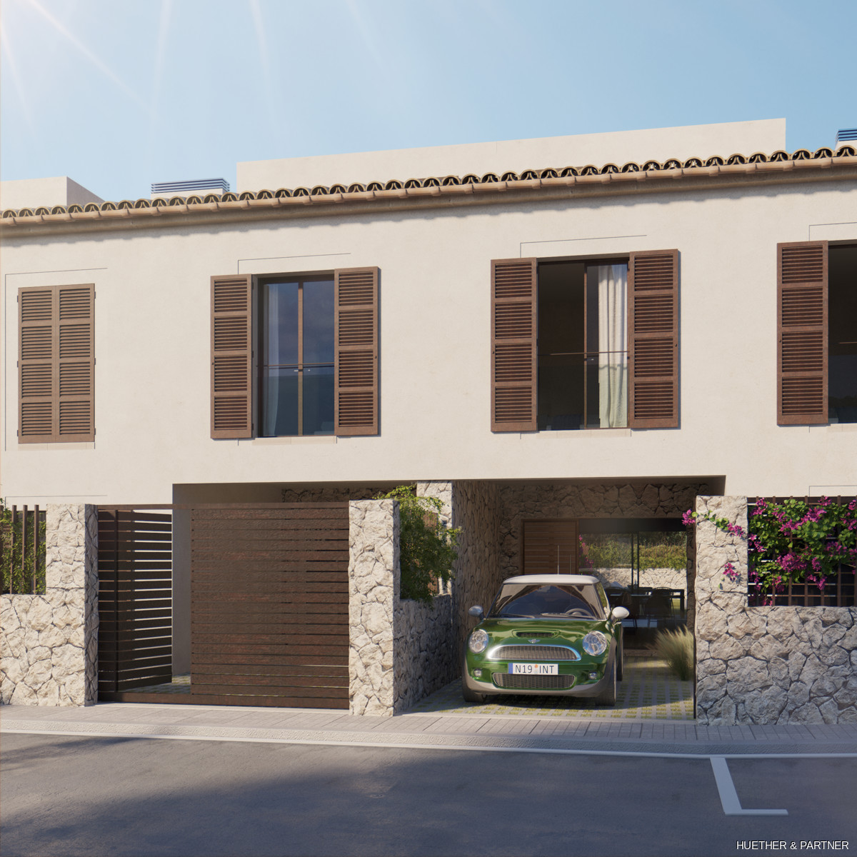 Jedes Haus verfügt über einen privaten Gartenbereich mit Pool und einen Einstellplatz (Porche) für ein Auto auf dem eigenen Grundstück.